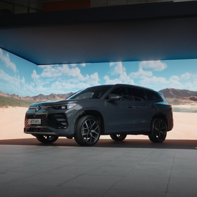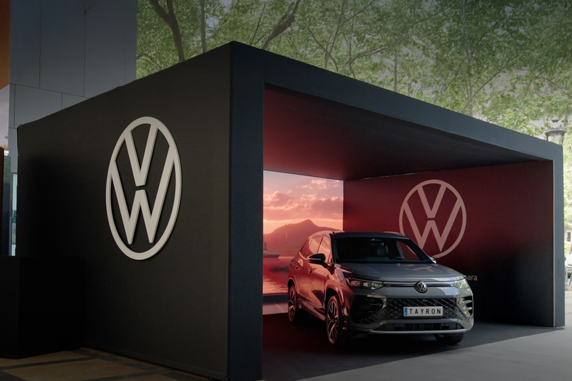 Frente al centro comercial L’Illa Diagonal, acompañamos a Volkswagen en la Tayron Cube Experience creando siete escenarios generados con IA y Unreal Engine para que los usuarios eligieran su destino ideal en una experiencia 360º que transformaba una exposición de producto en un viaje interactivo.